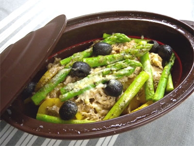 旬の野菜とツナ缶、瓶詰めのオリーブ、パルメザンチーズをオーバルに入れて、
